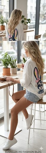 Să fim sincere: diminețile sunt pentru cafea și pentru soluții rapide. Cămașa oversized albă este aliatul tău numărul unu. Croiala relaxată îți oferă un confort absolut, dar surpriza grafică de pe spate – Iepurașul chic cu ochelari – este detaliul care îți scoate ținuta din anonimat încă de la prima oră.