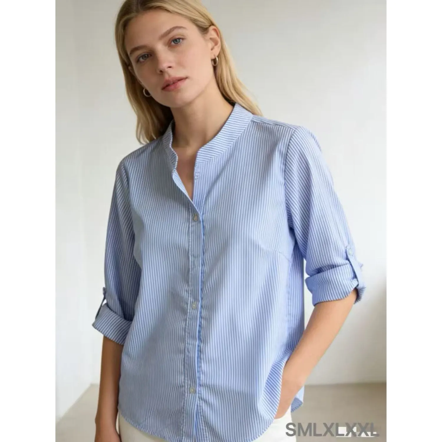 Cîmașa Business Stripes este piesa esențială care nu trebuie să lipsească din garderoba ta. Cu un imprimeu cu dungi verticale care alungește silueta și un guler tip tunică rafinat, această cămașă oferă un look curat, profesionist și mereu la modă.
